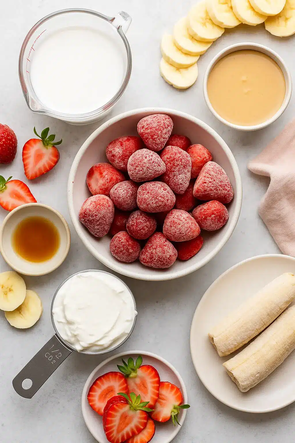 - Frozen Strawberries – A naturally sweet treat full of antioxidants. They’re what give this smoothie its vibrant color and fruity punch.